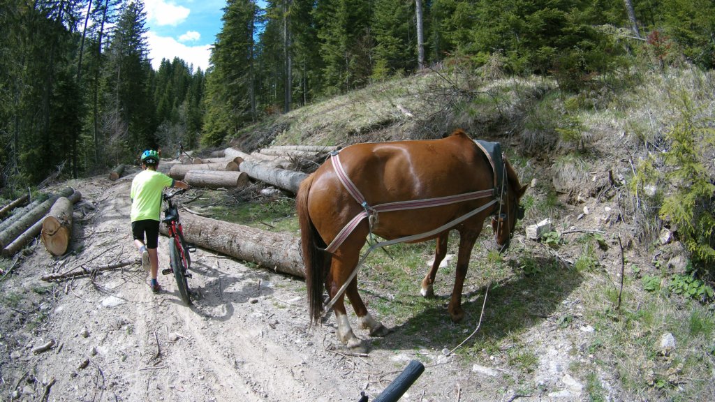 Кобила изтегля дървета от гората