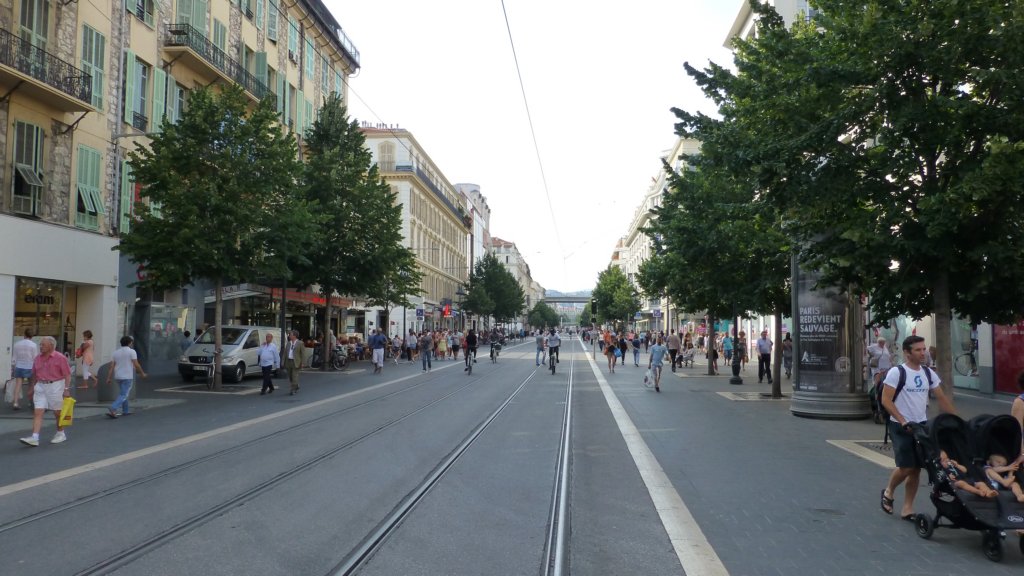 Главна улица в града, която ни отвежда от квартирата директно до площад Масена, а от там и до плажа. Вляво се вижда молът Nice Etoile