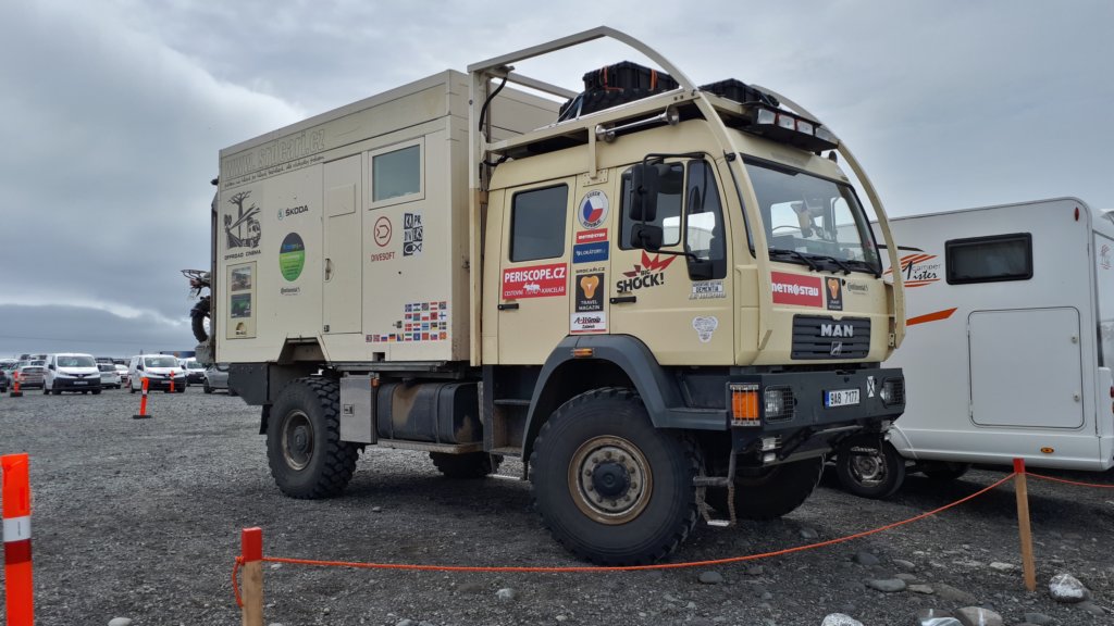 Чешки високопроходим кемпър с мотор BMW GS в задната част на паркинга при ледената лагуна Jökulsárlón