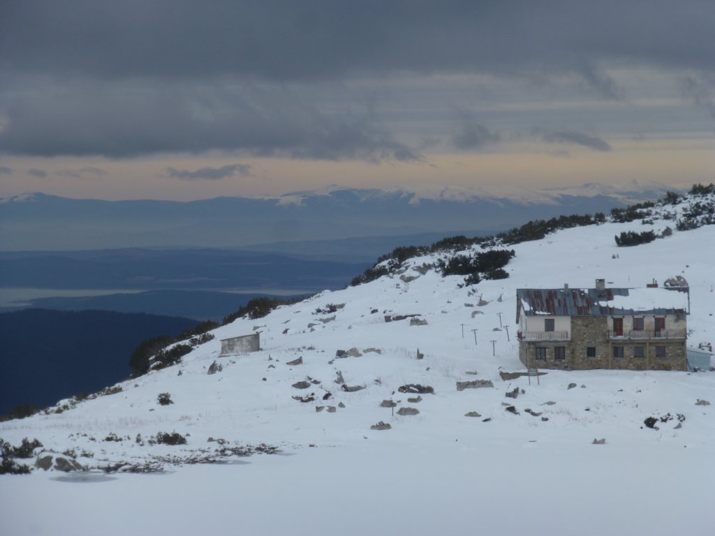 Пред нас е Рибното езеро и зад него х. Седемте езера, която не работи