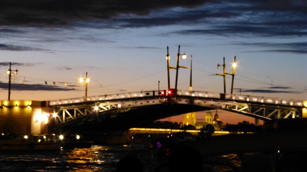 А на брега се вижда тълпата туристи чакащи отварянето на мостовете. Дворцовия мост ще се отвари само след няколко секунди. От това положение ще видят емблематичното за града изображение на отварящия се Дворцов мост, разкриващ кулата на Петропавловската крепост.
