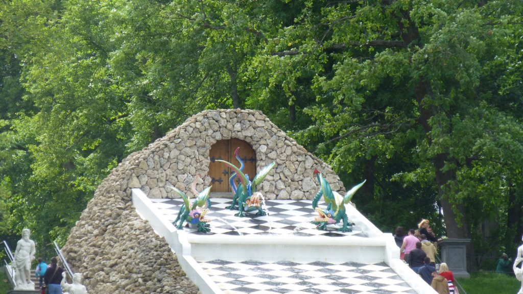 Каскадата се "охранява" от три дракона бълващи вода в горната и част. Отстрани са разположени 10 мраморни статуи на италиански майстори изработени през 18 в.