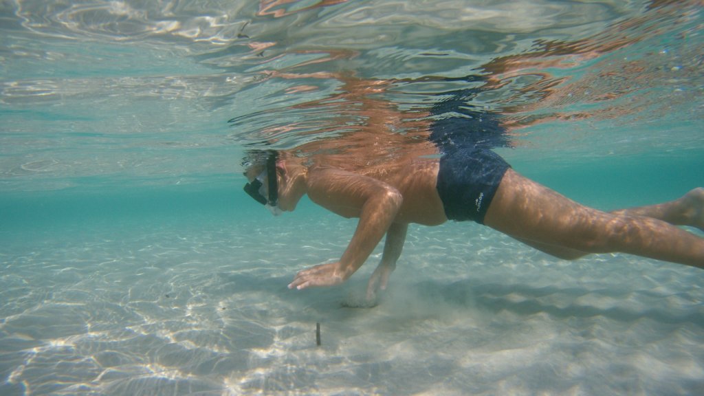 Боби се учи на шнорхелинг и да плува с плавници