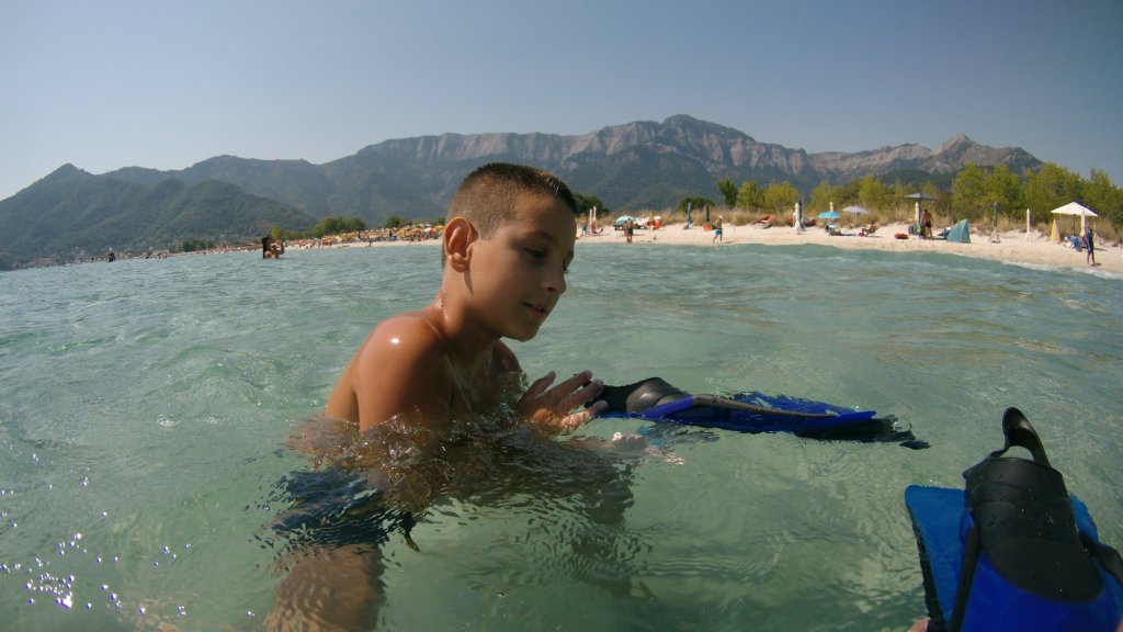 Боби се учи да плува по гръб и да се отпуска на водата