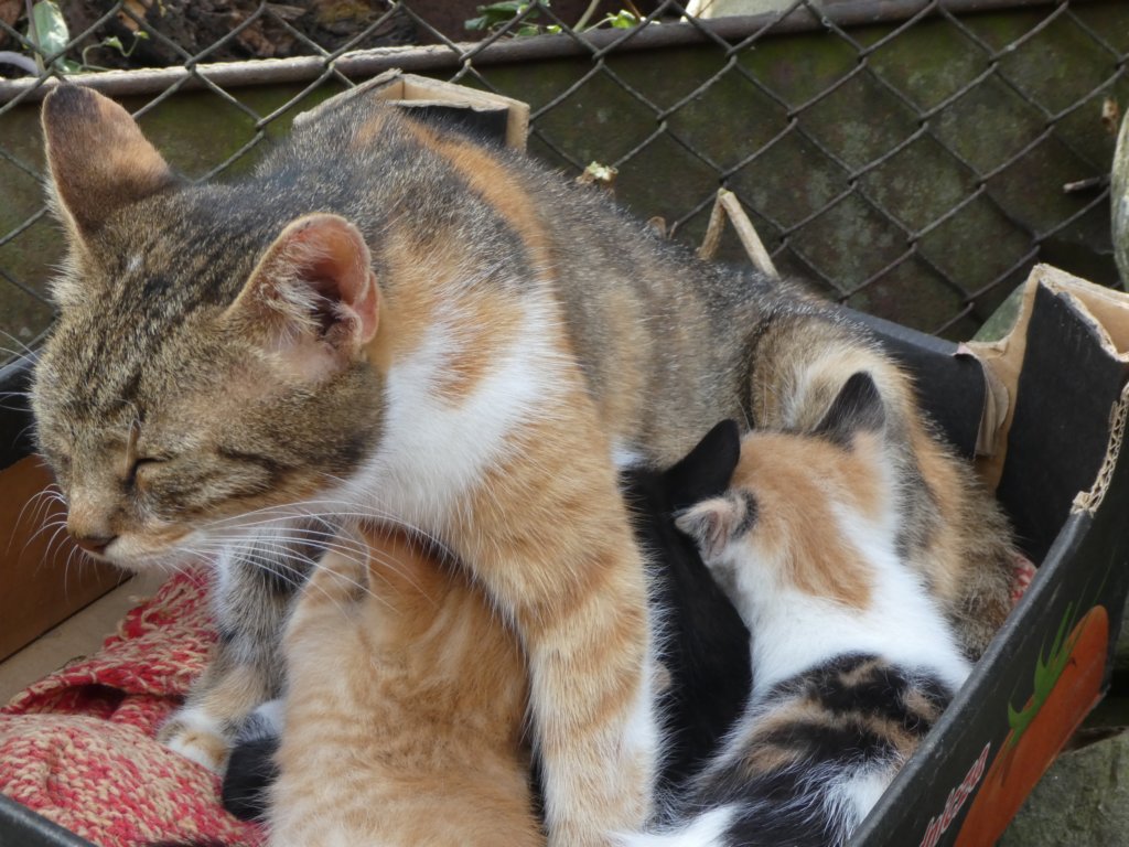 Мама котка с котенцата при баба Лили